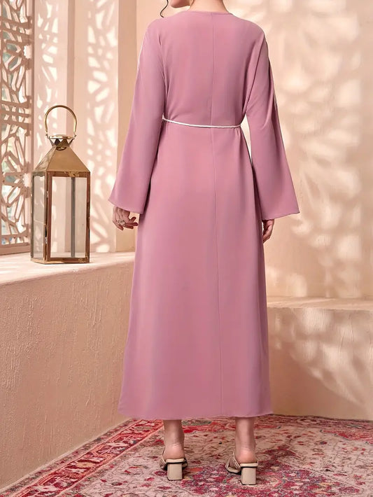 Elegant Tie Waist V-Neck Abaya Maxi Dress