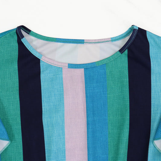 Elegant Striped Maxi Dress with Ruffle Sleeves and Lace-Up Detail