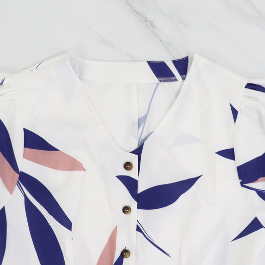 Elegant V-Neck Slimming Dress with Button and Puff Sleeves