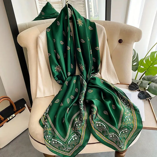 Paisley Printed Chiffon Scarf, Smooth Satin Shawl, Green