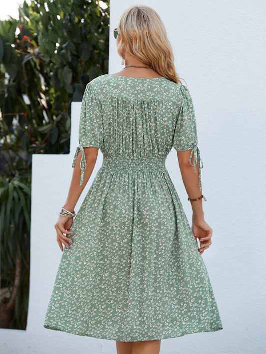 Single-Breasted Floral Short Sleeve V-neck Dress