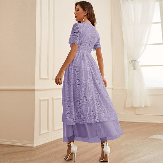 Elegant Summer Lace Stitching Mesh Solid Color Maxi