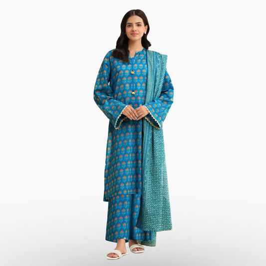Teal Blue Digital Printed Khaddar 3 Piece Suit