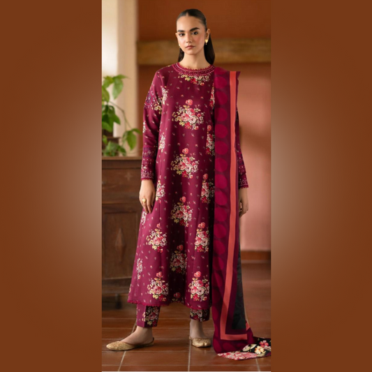 Burgundy Floral Digital Printed Khaddar 3 Piece Suit