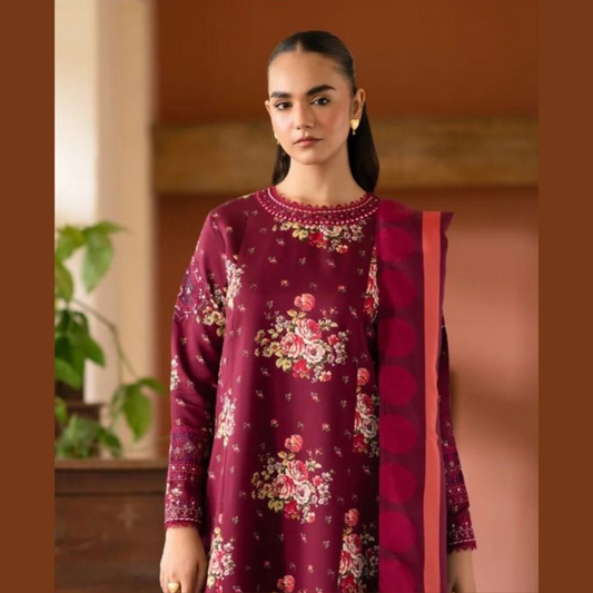 Burgundy Floral Digital Printed Khaddar 3 Piece Suit