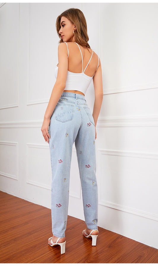 Embroidered Denim Straight Pants
