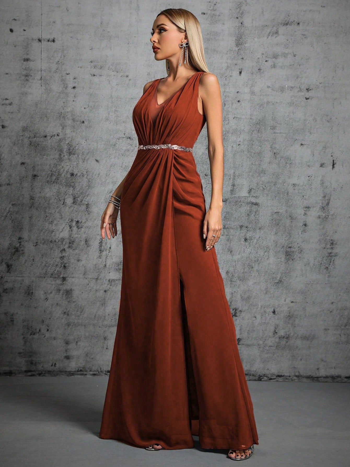 Command attention at your next formal event with Malbusaat's Sexy V-Neck Evening Dress. This slim-fit A-line maxi dress features a plunging V-neckline, a daring thigh-high split, and shimmering sequin embellishments. The lace and patchwork details add a touch of sophistication, while the sleeveless, backless design enhances its allure. Perfect for annual parties, cocktail events, or hosting duties, this brown polyester dress combines elegance and sensuality effortlessly.