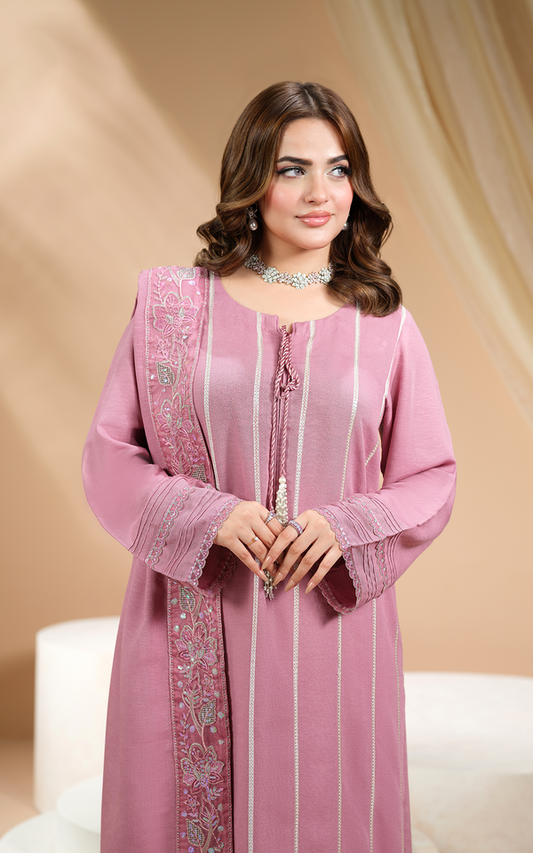 Step into elegance with our Emerald Dream embroidered khaddar suit, a perfect fusion of sophistication and comfort. Crafted from air jet soft khaddar, the shirt features intricate sequin embroidery, complemented by lace detailing on the neckline and daman. The matching sequin-embroidered plazo adds a graceful charm, while the Bareeza net sublimation dupatta with foil printing completes this timeless ensemble for winter occasions or festive gatherings.