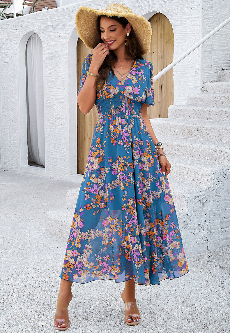 Elevate your summer wardrobe with our elegant floral maxi dress. Crafted from lightweight polyester, it offers both style and comfort. The smocked waist creates a flattering silhouette, while the V-neckline adds a touch of allure. Perfect for vacations or daily wear, this dress combines boho charm with effortless sophistication.
