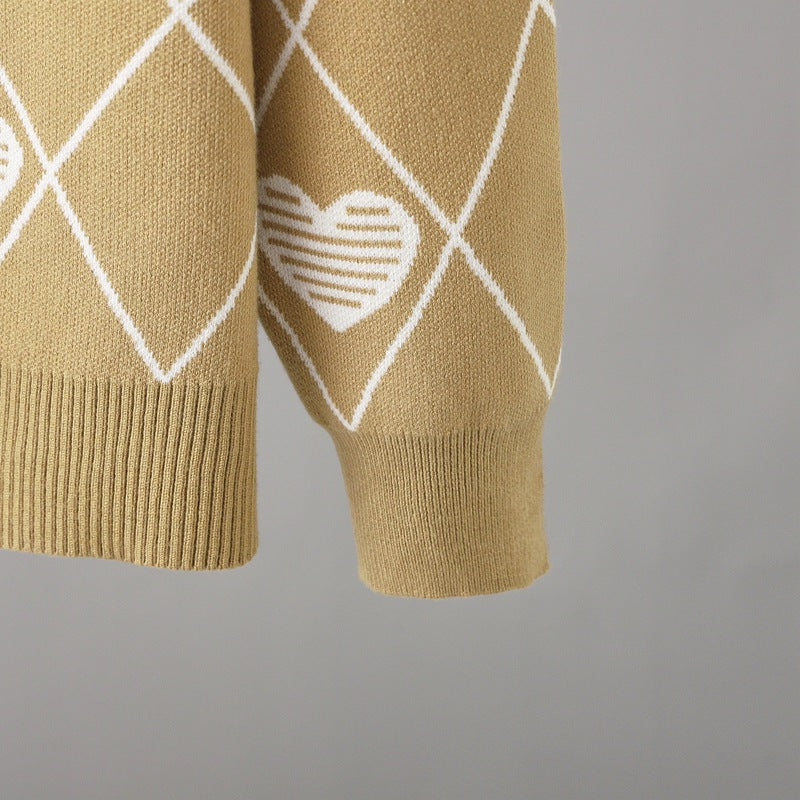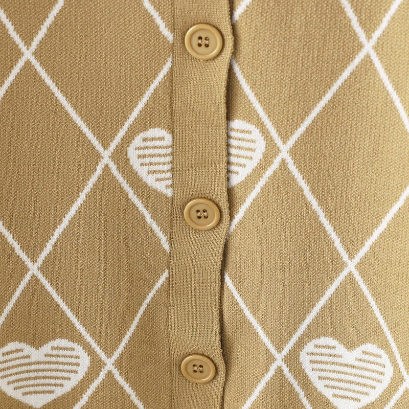 The cardigan is knitted from acrylic fabric, and features a heart pattern. The sweater is made in a loose fit and is available in many colors.